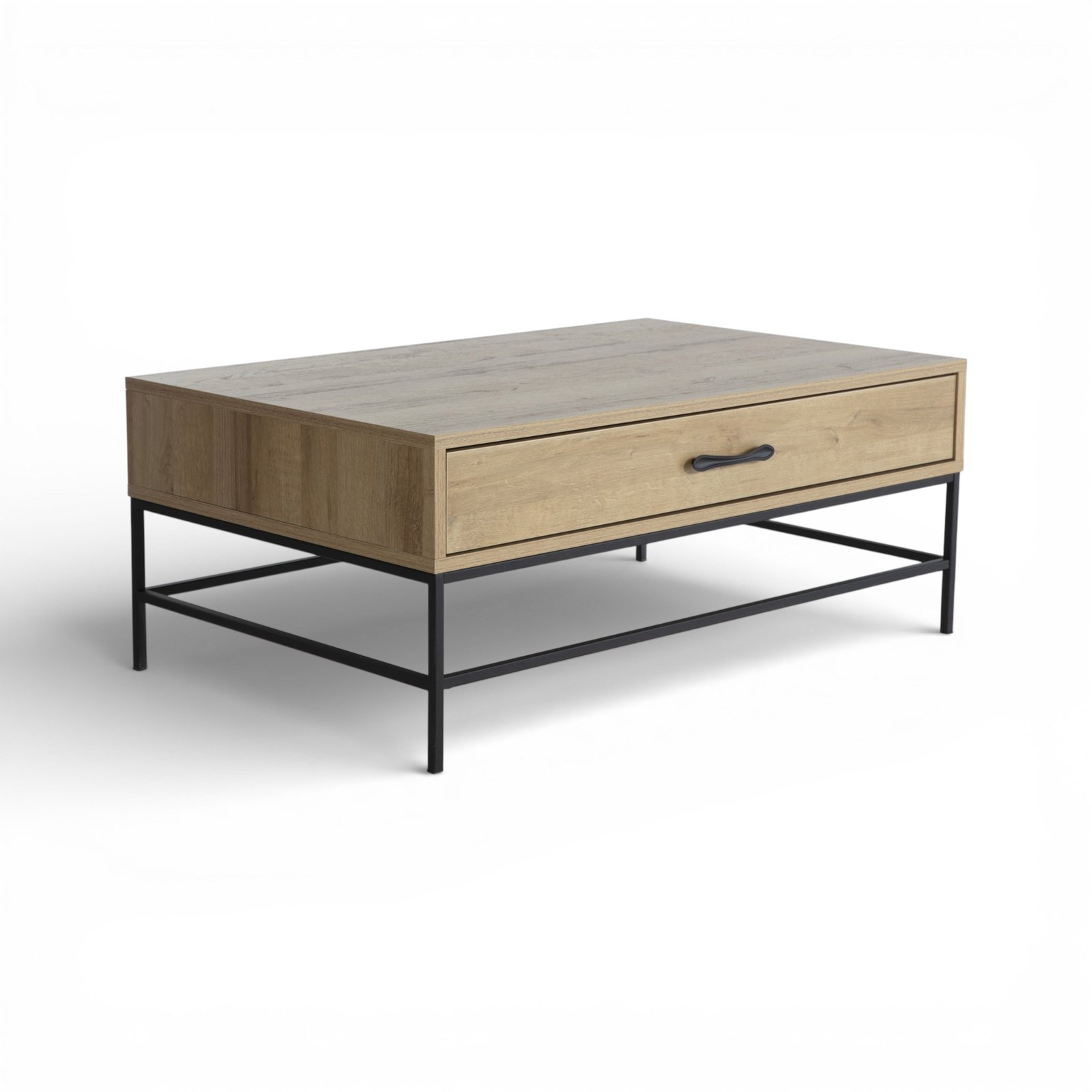 Distinct lines and contrasting tones create a strikingly modern appearance in the Drift Coffee Table. A light finished wood body mixes vertical and horizontal lines with natural grain variations while wrought iron legs and hardware deliver a sharp color contrast for an almost industrial look. The table features a spacious drawer with an ergonomic handle that’s perfect for housing TV remotes, magazines, coasters and more.